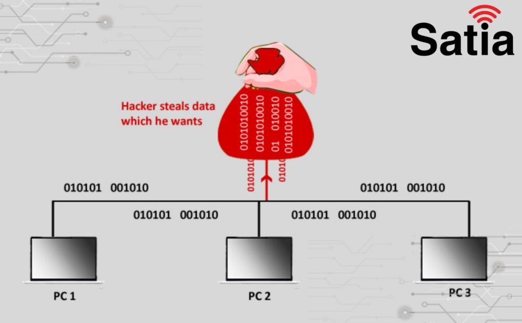شرح: مهاجم با استفاده از ابزارهایی مانند Wireshark، ترافیک عبوری از شبکه را شنود کرده و اطلاعات حساس مانند رمزهای عبور را استخراج میکند.